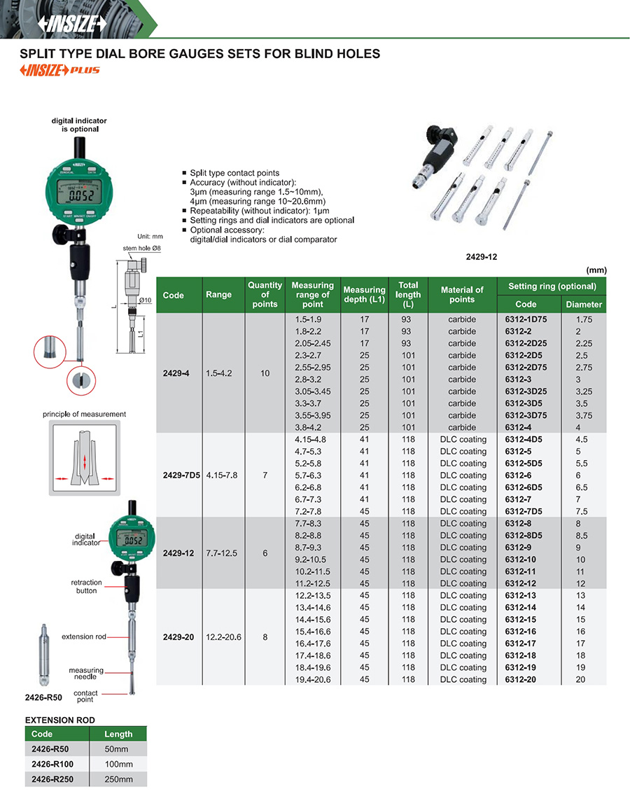 | 2429-12 | 7.7-12.5mm | 3µm (measuring range 1.5~10mm), 4µm (measuring range 10~20.6mm) | 1µm |
