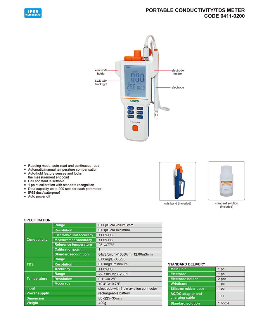 | 0411-0200 | conductivity/TDS | off-line | 0.00μS/cm~200mS/cm, 0.00mg/L~300g/L, -5~110°C/23~230°F | no |