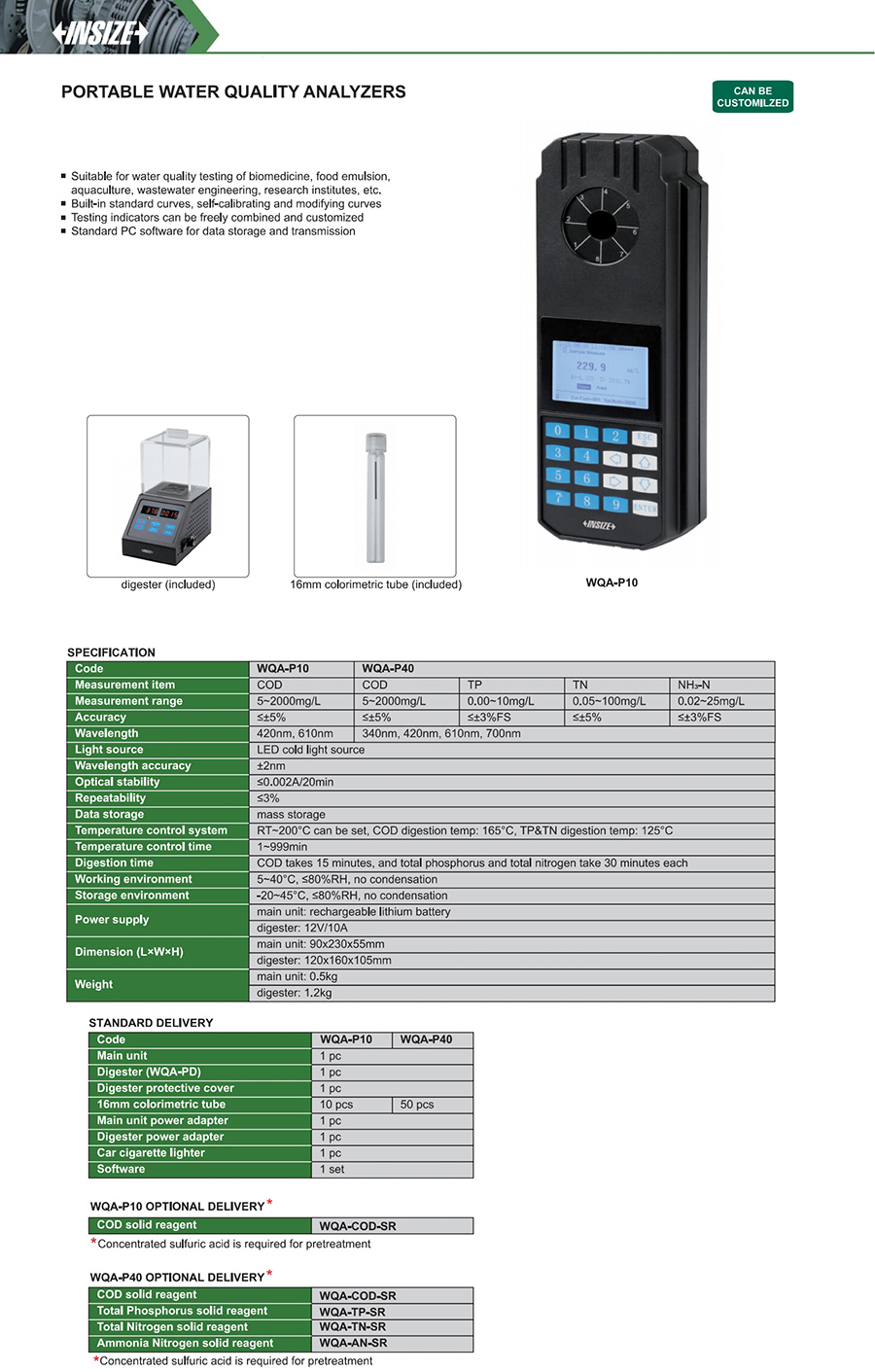 | WQA-P10 | 5~2000mg/L | ≤±5% | 420nm, 610nm | COD |