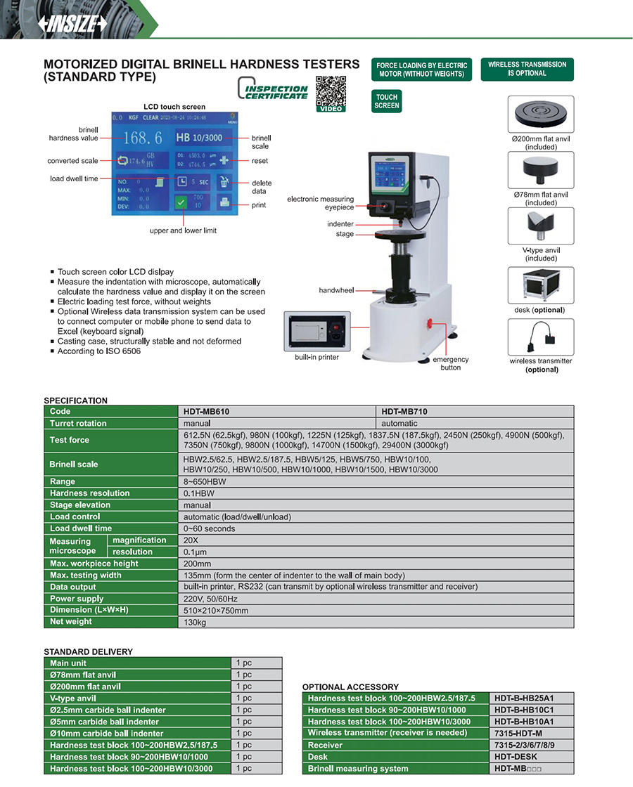 | HDT-MB710 | 62.5kgf, 100kgf, 125kgf, 187.5kgf, 250kgf, 500kgf, 750kgf, 1000kgf, 1500kgf, 3000kgf | automatic | 200mm | 135mm (form the center of indenter to the wall of main body) | HBW2.5/62.5, HBW2.5/187.5, HBW5/125, HBW5/750, HBW10/100, HBW10/250, HBW10/500, HBW10/1000, HBW10/1500, HBW10/3000 |