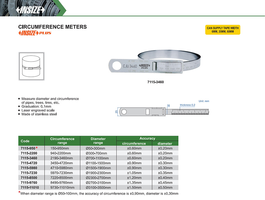 Code Graduation Diameter range Circumference range Circumference accuracy Diameter accuracy