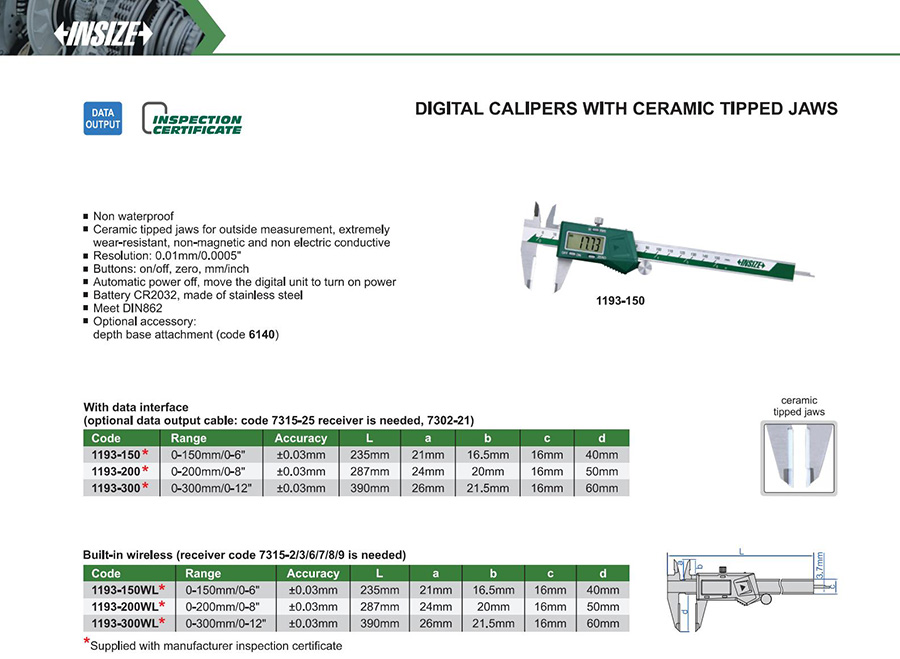 | 1193-150WL | 0-150mm/0-6" | ±0.03mm | 0.01mm/0.0005" | built-in wireless |