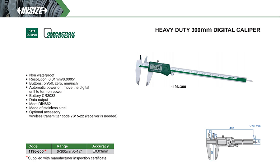 | 1196-300 | 0-300mm/0-12" | ±0.03mm | 0.01mm/0.0005" | with data interface |