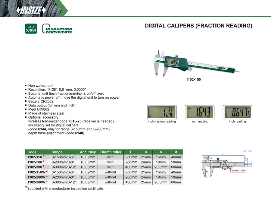 | 1102-150 | 0-150mm/0-6" | ±0.02mm | 1/128", 0.01mm, 0.0005" | with data interface | with |