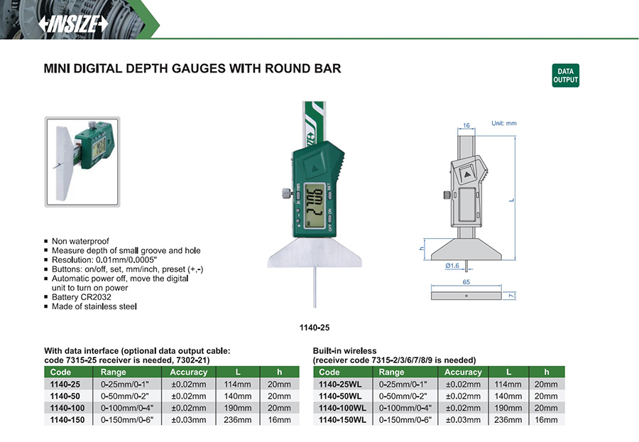 | 1140-25 | 0-25mm/0-1" | ±0.02mm | 0.01mm/0.0005" | with data interface |