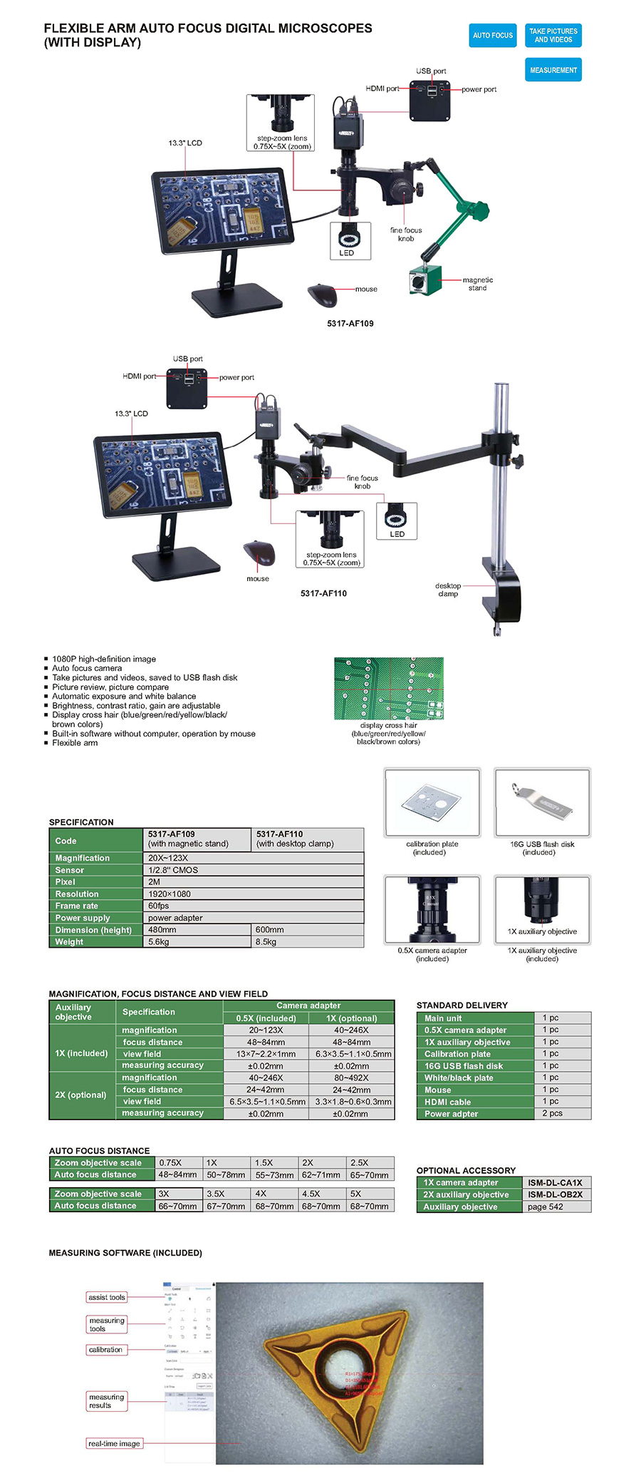 | 5317-AF109 | auto focus digital microscopes | 20X~123X | 13×7~2.2×1mm, 6.3×3.5~1.1×0.5mm | 2M |