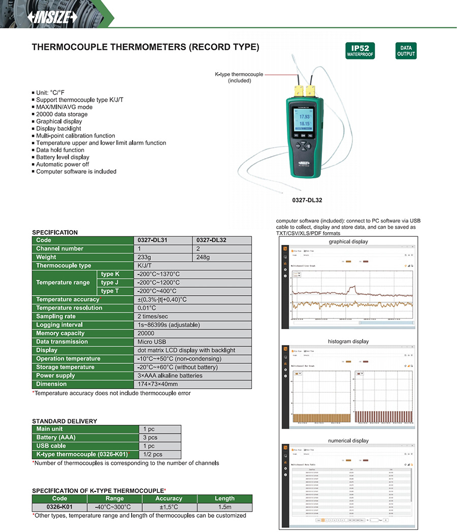 | 0327-DL32 | K | thermocouple | ±(0.3%∙|t|+0.40)°C | 2 | yes | -200°C~1370°C |