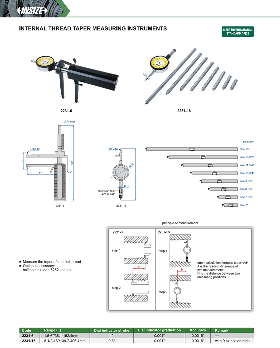 | 2231-16 | 5 1/2-16"/139.7-406.4mm | 0.0015" | 0.001" | taper |