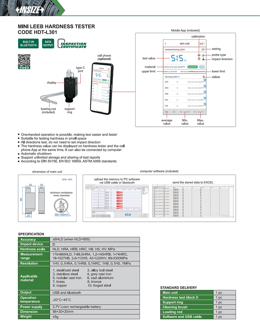 HDT-L301 170-960HLD, 7-88.5HRA, 1.2-140HRB, 1-74HRC, 18-1027HB, 3.9-112HS, 42-1220HV, 89-3300MPa 3.7V Li-ion rechargeable battery