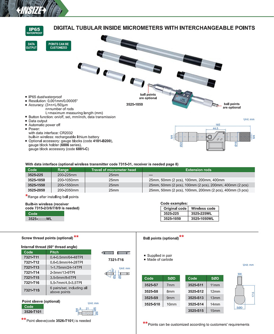 | 3525-225WL | 200-225mm | (3+n+L/50)µm | 0.001mm/0.00005" | built-in wireless |