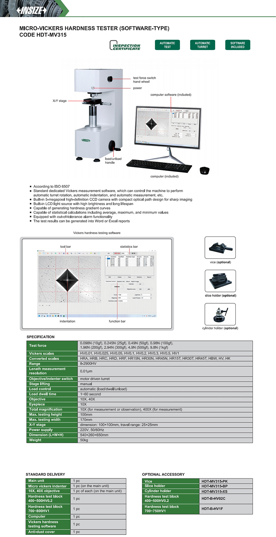 | HDT-MV315 | automatic (load/dwell/unload) | 100mm | 170mm | HV0.01, HV0.025, HV0.05, HV0.1, HV0.2, HV0.3, HV0.5, HV1 | 100X (for measurement or observation), 400X (for measurement) |