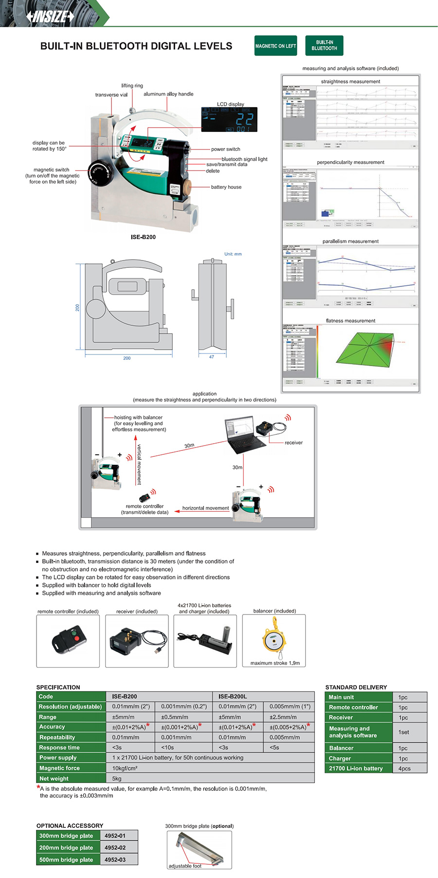| ISE-B200L | ±2.5mm/m | ±(0.005+2%A) | 0.005mm/m (1") | 0.005mm/m | 10kgf/cm² |