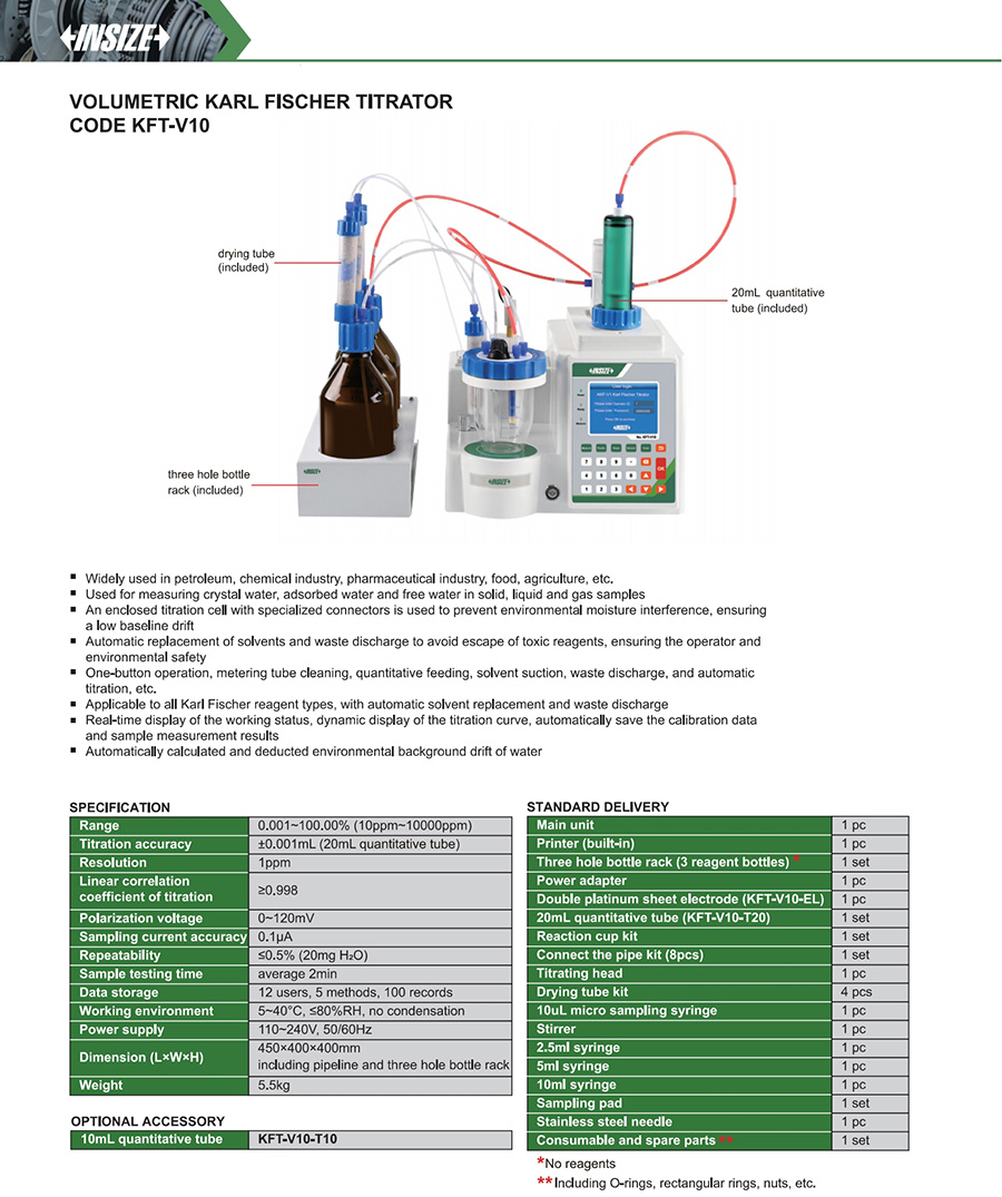 KFT-V10 0.001~100.00% (10ppm~10000ppm) Titration accuracy: ±0.001mL (20mL quantitative tube) 1ppm