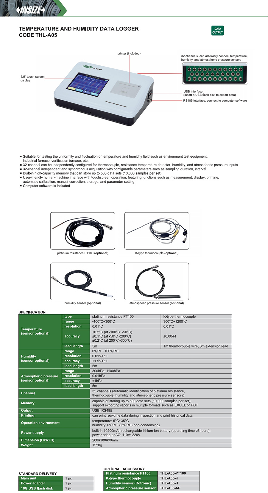 THL-A05 ±0.2°C (at -100°C~-50°C), ±0.1°C (at -50°C~200°C), ±0.2°C (at 200°C~300°C), ±0.004∙t 0%RH~100%RH ±1.5%RH -100°C~300°C, 300°C~1200°C 300hPa~1100hPa ±1hPa