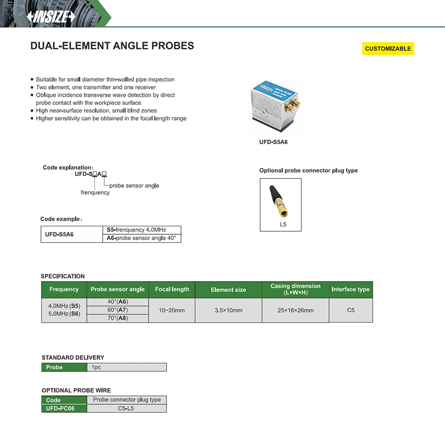 UFD-S□A□ 4.0MHz(S5), 5.0MHz(S6) 40°(A6), 60°(A7), 70°(A8) 10~20mm 3.5x10mm C5
