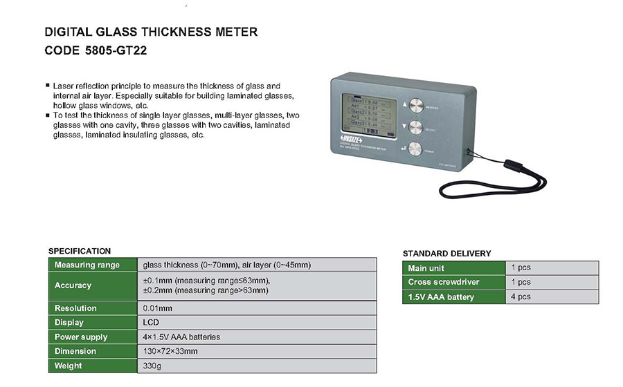 | 5805-GT22 | glass thickness (0~70mm), air layer (0~45mm) | ±0.1mm (measuring range≤63mm), ±0.2mm (measuring range>63mm) |