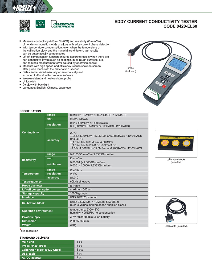 0420-EL60 Conductivity:0.3MS/m~65MS/m or 0.51%IACS~112%IACS Conductivity:0.5%(20℃)*