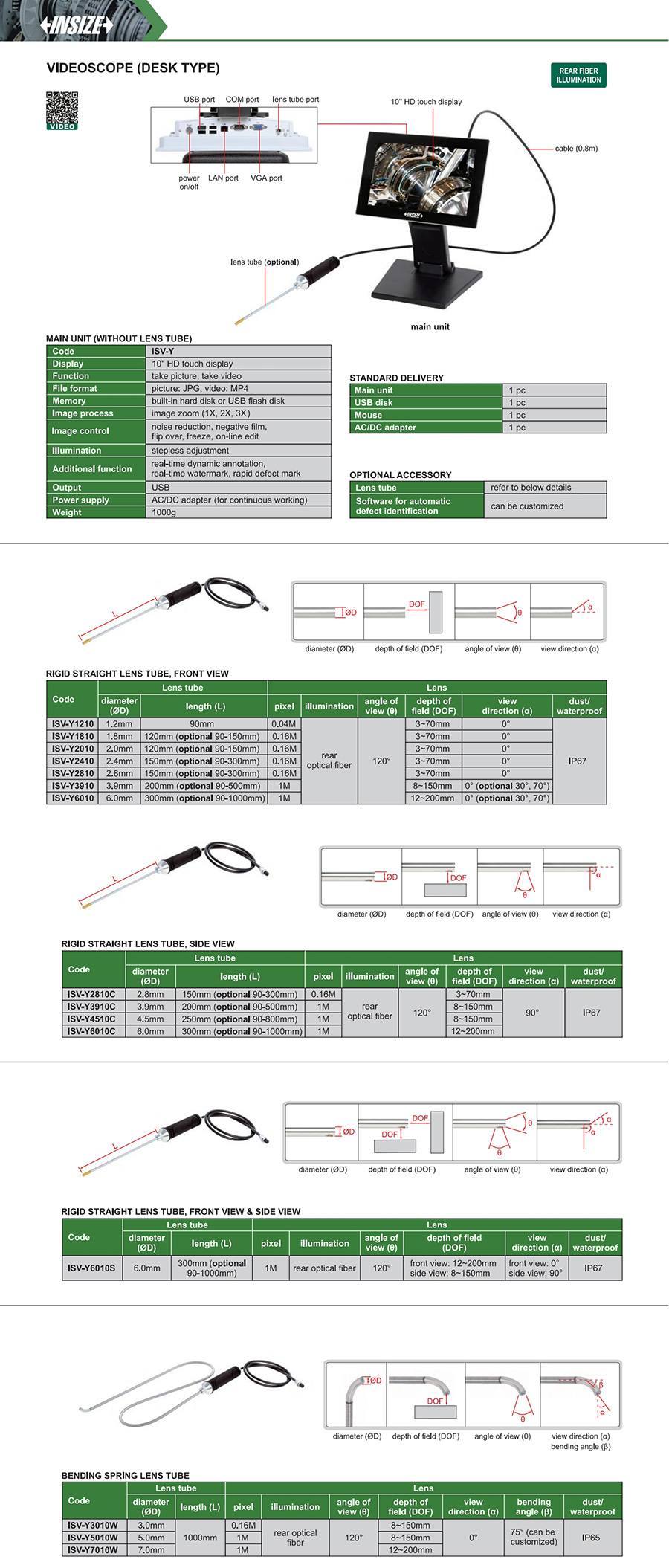ISV-Y6010S rigid straight lens tube front view, side view 6.0mm 300mm (optional 90-1000mm) 120°