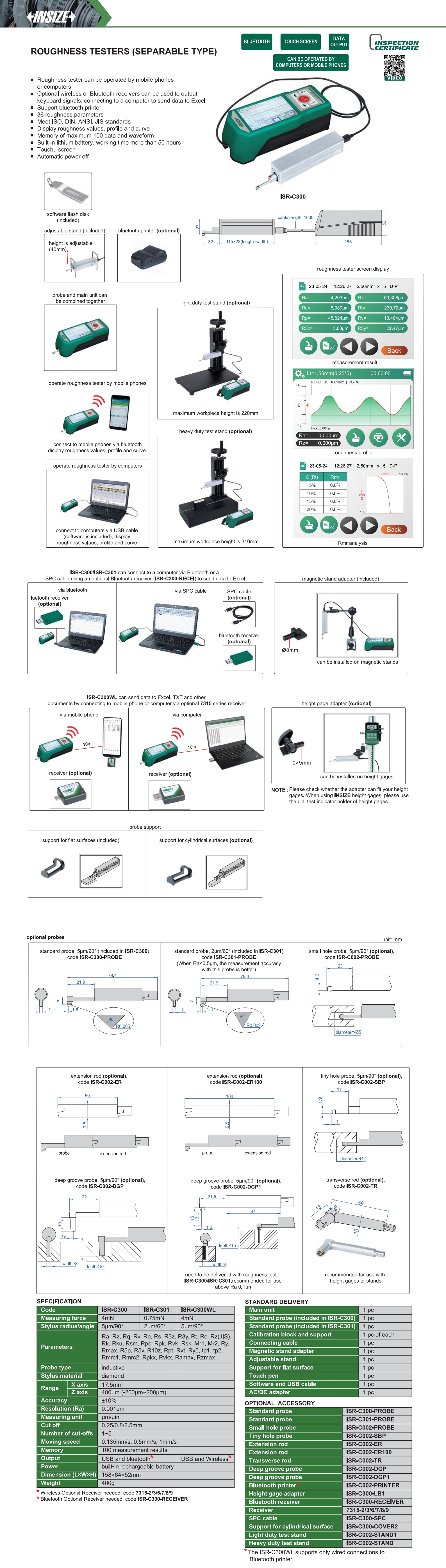 ISR-C300 X axis 17.5mm/Z axis 400µm (-200µm~200µm) 4mN 5µm/90° USB and bluetooth