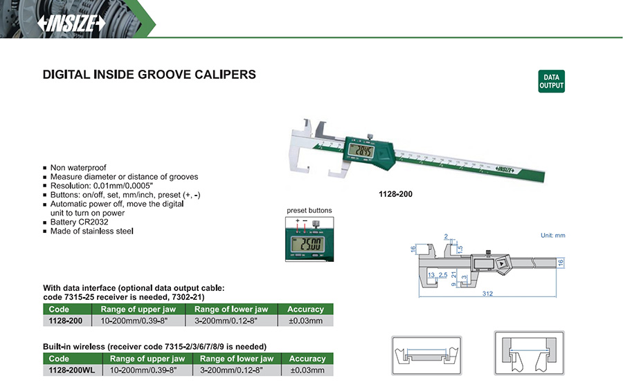 1128-200 10-200mm/0.39-8" 3-200mm/0.12-8" ±0.03mm 0.01mm/0.0005" with data interface