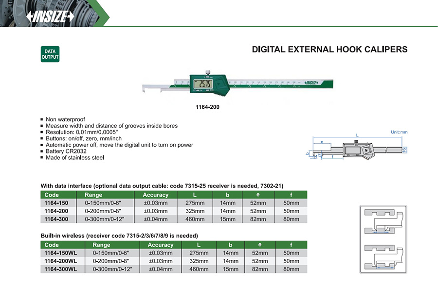 | 1164-200WL | 0-200mm/0-8" | ±0.03mm | 0.01mm/0.0005" | built-in wireless |