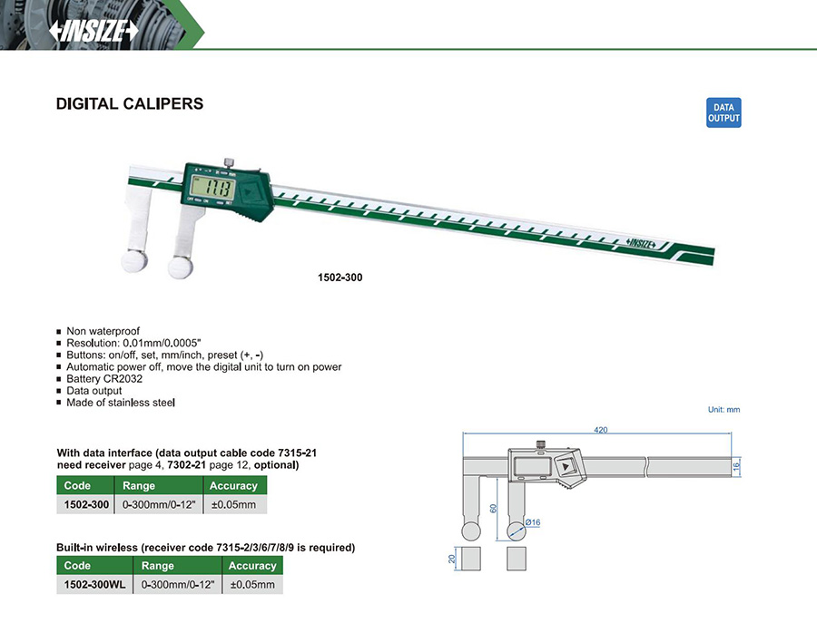| 1502-300WL | 0-300mm/0-12" | ±0.05mm | 0.01mm/0.0005" | built-in wireless |