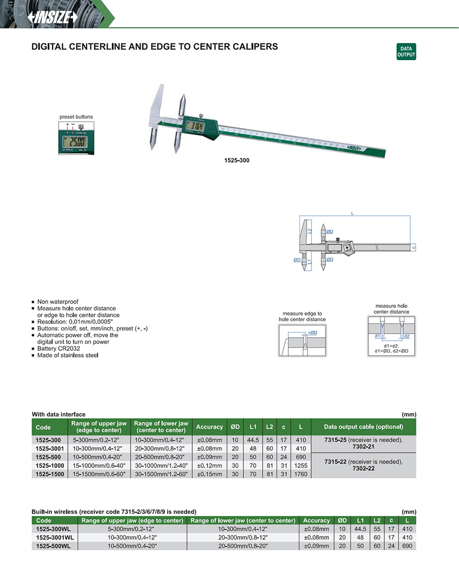 1525-3001 edge to center: 10-300mm/0.4-12" center to center: 20-300mm/0.8-12" ±0.08mm 0.01mm/0.0005" with data interface