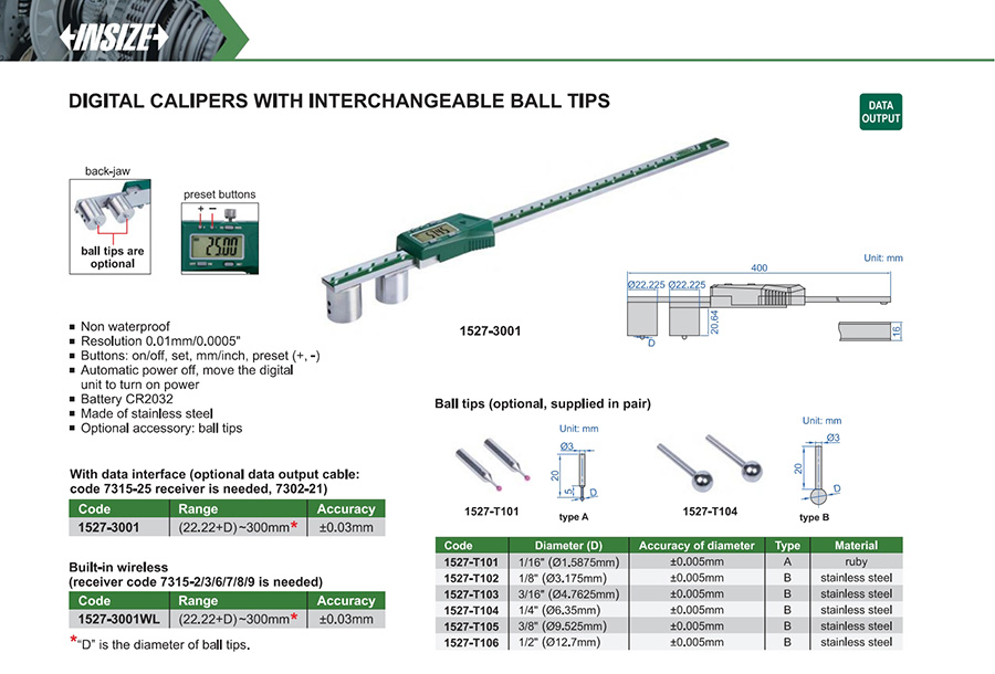 1527-3001 (22.22+D)~300mm ±0.03mm 0.01mm/0.0005" with data interface