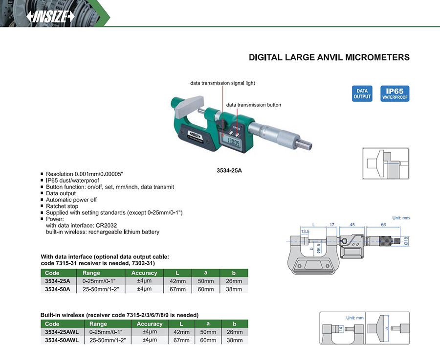 3534-25AWL 0-25mm/0-1" ±4μm 0.001mm/0.00005" built-in wireless
