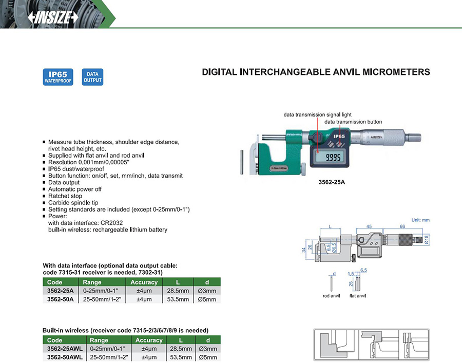 3562-25AWL 0-25mm/0-1" ±4μm 0.001mm/0.00005" built-in wireless