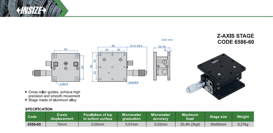 Code Parallelism Z-axis displacement Micrometer graduation Micrometer accuracy Stage size