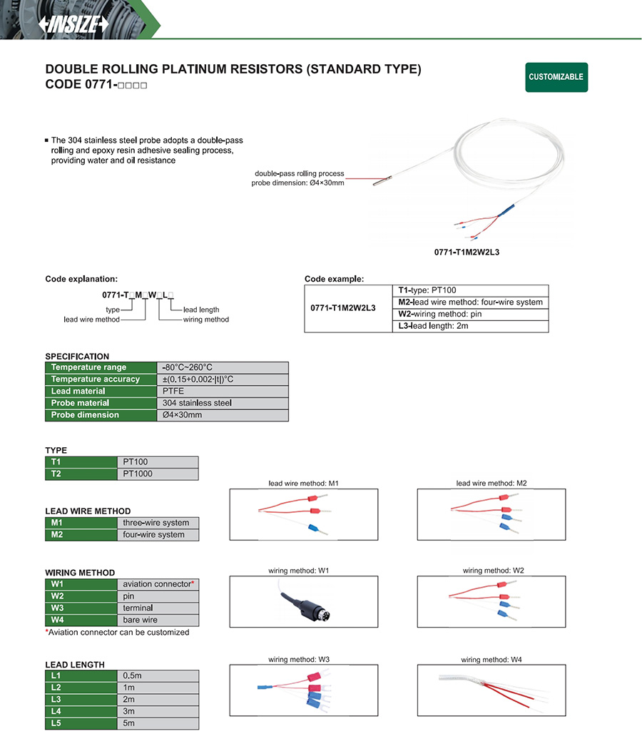 0771-□□ PT100, PT1000 platinum resistor -80°C~260°C ±(0.15+0.002∙|t|)°C