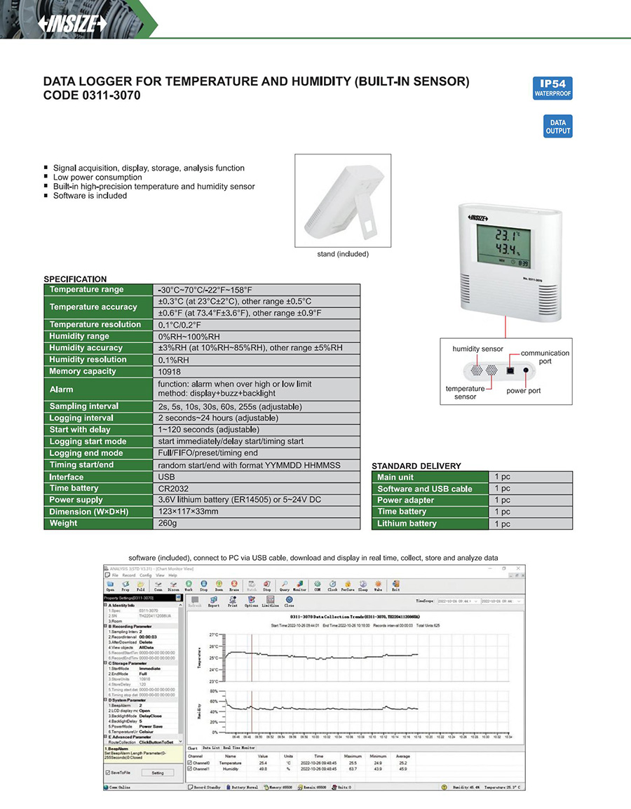 0311-3070 digital internal ±0.3°С (at 23°С±2°С), other range ±0.5°С/±0.6°F (at 73.4°F±3.6°F), other range ±0.9°F 0%RH~100%RH ±3%RH (at 10%RH~85%RH), other range ±5%RH yes yes yes -30°C~70°C/-22°F~158°F