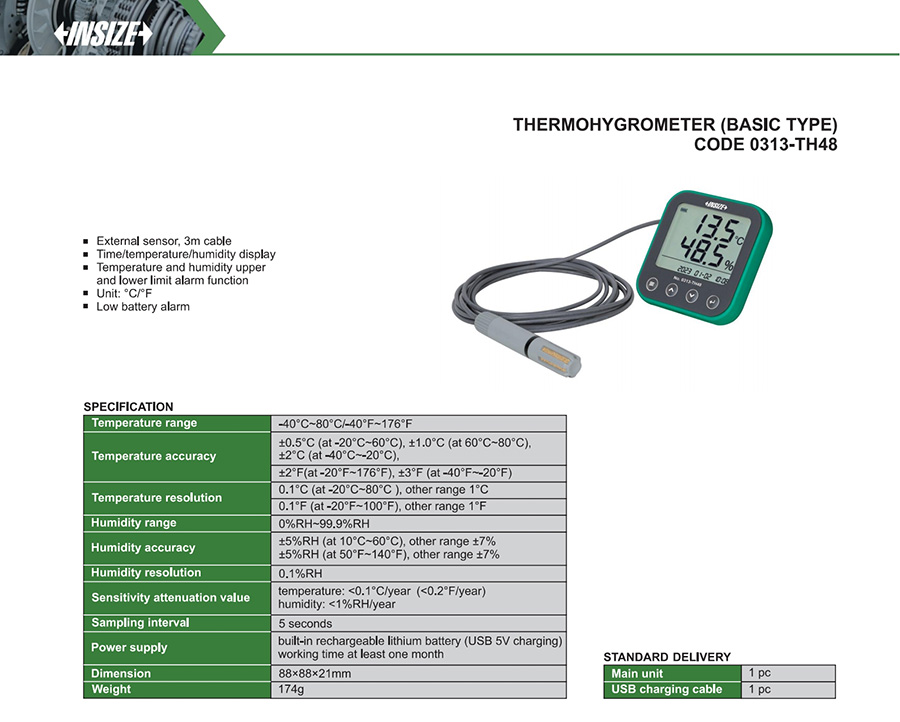 | 0313-TH48 | digital | external | ±0.5°С (at -20°С~60°С), ±1.0°С (at 60°С~80°С), ±2°С (at -40°С~-20°С)/ ±2°F(at -20°F~176°F), ±3°F (at -40°F~-20°F) | 0%RH~99.9%RH | ±5%RH (at 10°С~60°С), other range ±7%/ ±5%RH (at 50°F~140°F), other range ±7% | yes | -40°С~80°С/-40°F~176°F |