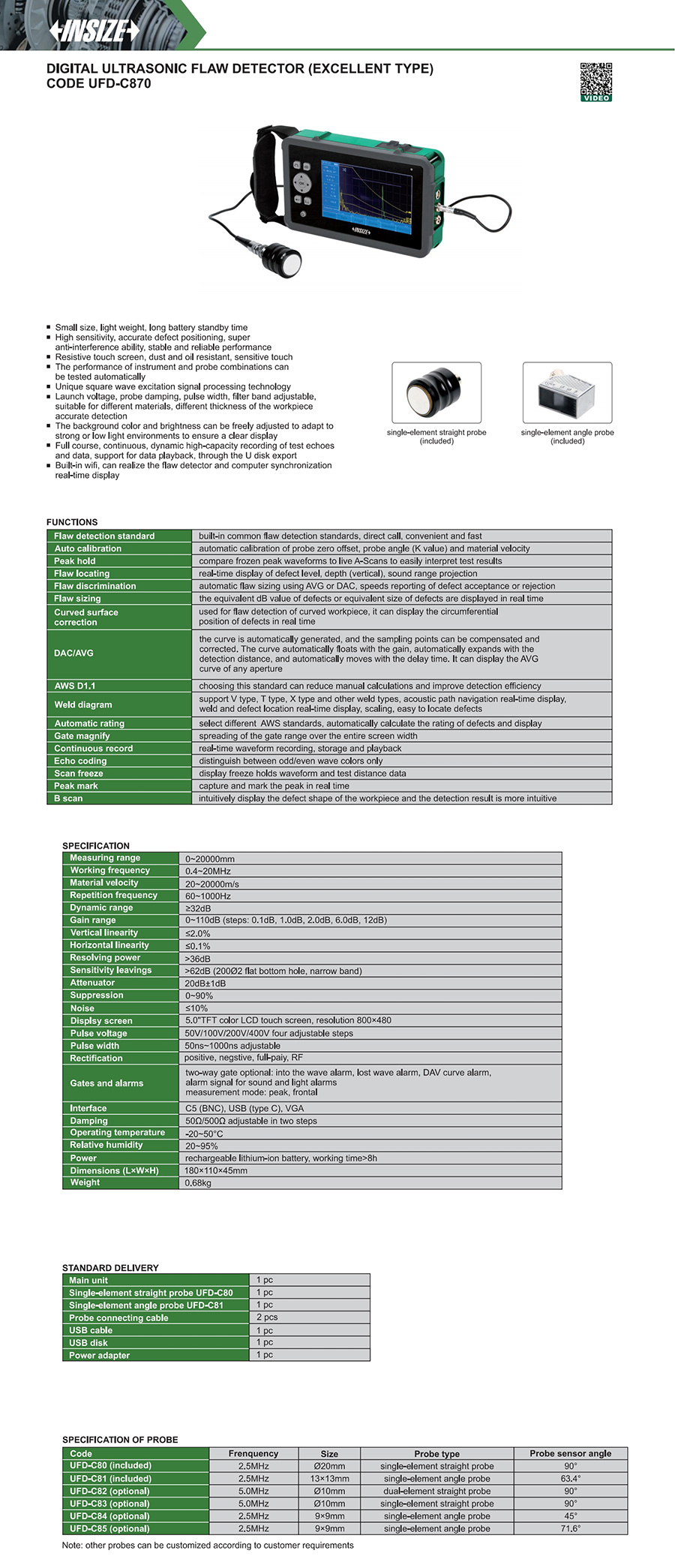 UFD-C870 0~20000mm 0.4~20MHz ≤2.0% ≤0.1% ≥32dB >36dB >62dB (200Ø2 flat bottom hole, narrow band)