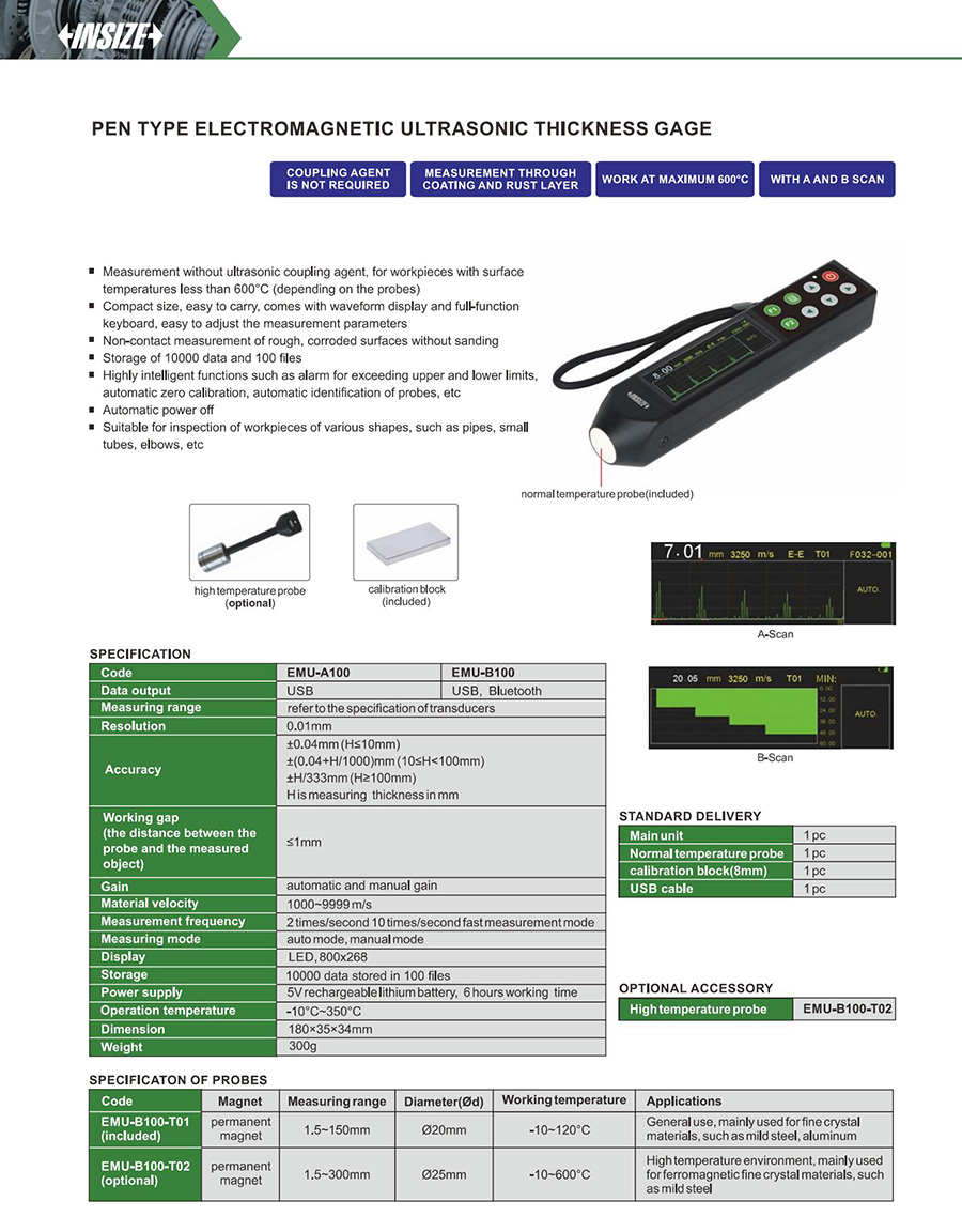 EMU-B100 1.5~150mm ±0.04mm (H≤10mm), ±(0.04+H/1000)mm (10≤H<100mm), ±H/333mm (H≥100mm) USB, Bluetooth 1000~9999 m/s 20mm