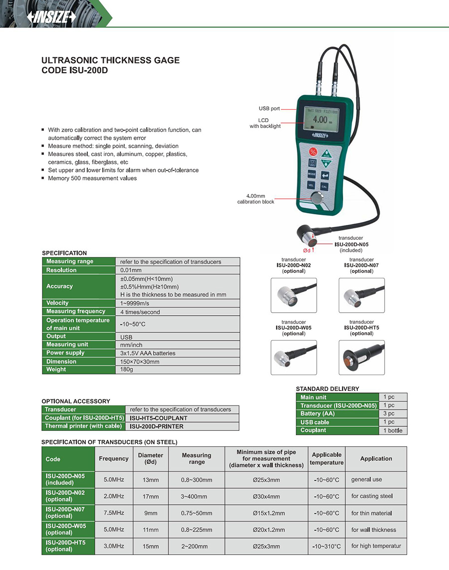 | ISU-200D | 0.8~300mm | ±0.05mm (H<10mm), ±0.5%Hmm (H≥10mm) | 5.0MHz | USB | 1~9999m/s | 13mm |