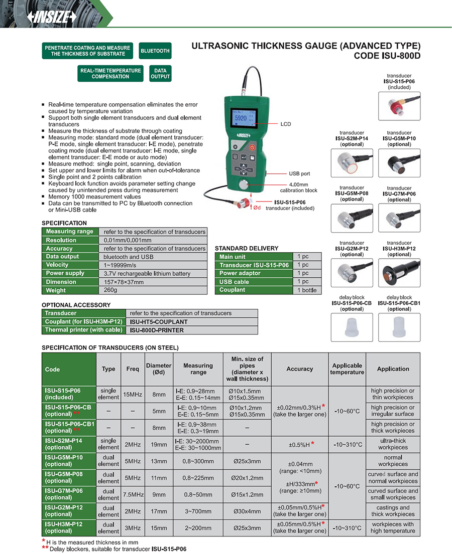 | ISU-800D | I-E: 0.9~28mm, E-E: 0.15~14mm | ±0.02mm/0.3%H | 8mm | 15MHz | bluetooth and USB | 1~19999m/s |