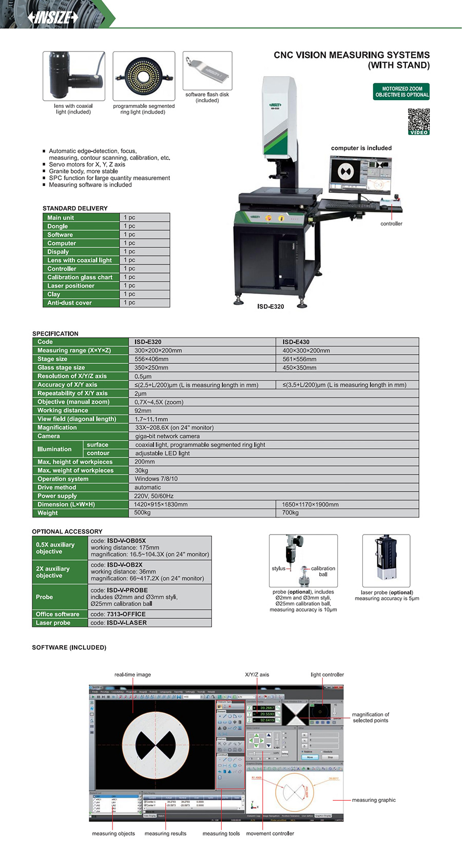 ISD-E430 400×300×200mm ≤(3.5+L/200)µm (L is measuring length in mm) 0.5µm 2µm 33X~208.6X (on 24'' monitor) 30kg