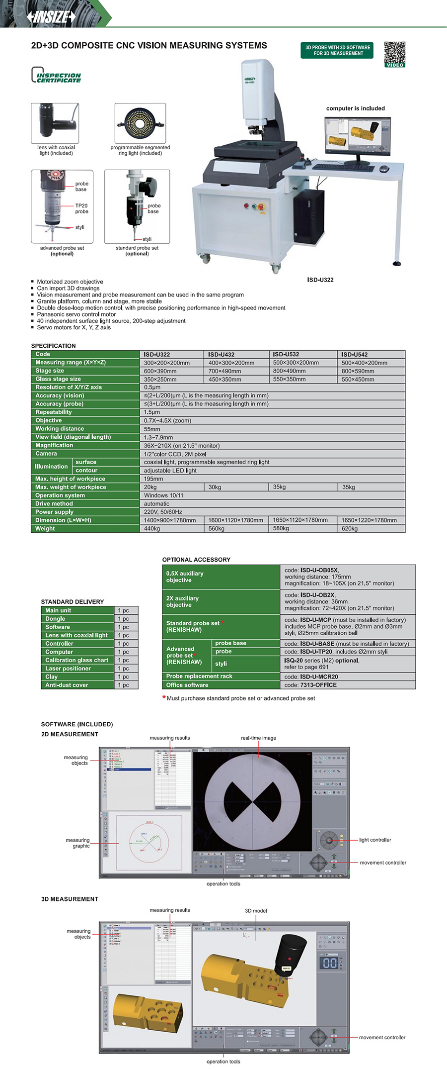 ISD-U532 500×300×200mm vision:≤(2+L/200)μm, probe:≤(3+L/200)μm 0.5μm 1.5μm 36X~210X (on 21.5'' monitor) 35kg