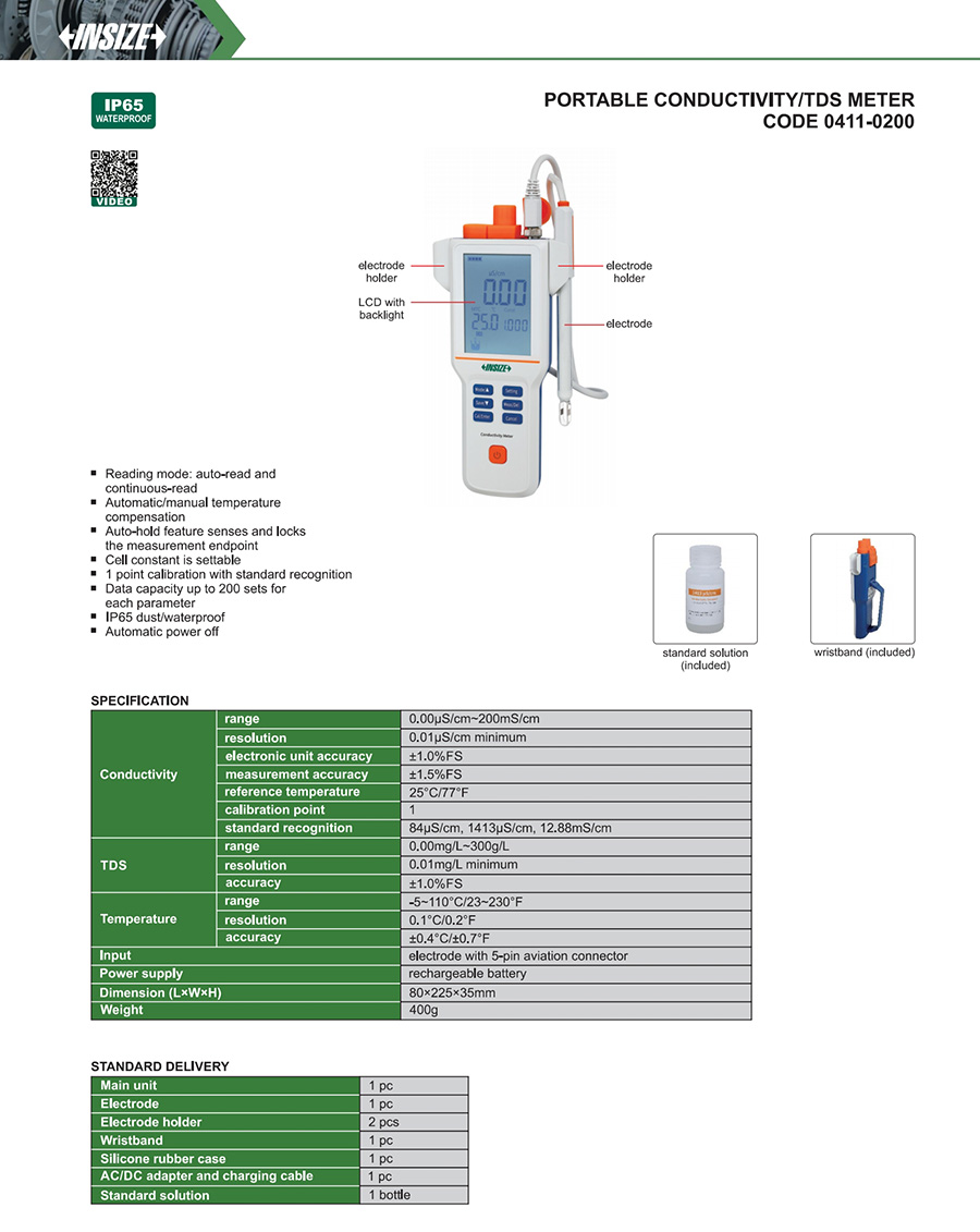| 0411-0200 | conductivity/TDS | off-line | 0.00μS/cm~200mS/cm, 0.00mg/L~300g/L, -5~110°C/23~230°F | no |