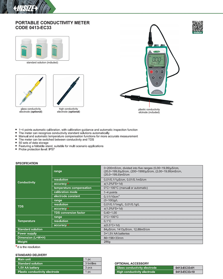0413-EC33 conductivity/TDS off-line 0~200mS/cm, divided into five ranges (0.00~19.99)μS/cm, (20.0~199.9)μS/cm, (200~1999)μS/cm, (2.00~19.99)mS/cm, (20.0~199.9)mS/cm, (0~100)g/L no