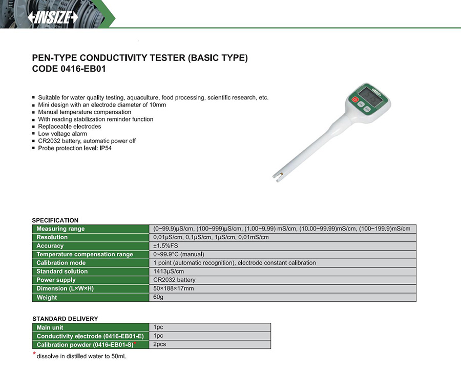 | 0416-EB01 | conductivity/TDS | off-line | (0~99.9)μS/cm, (100~999)μS/cm, (1.00~9.99) mS/cm, (10.00~99.99)mS/cm, (100~199.9)mS/cm | no |