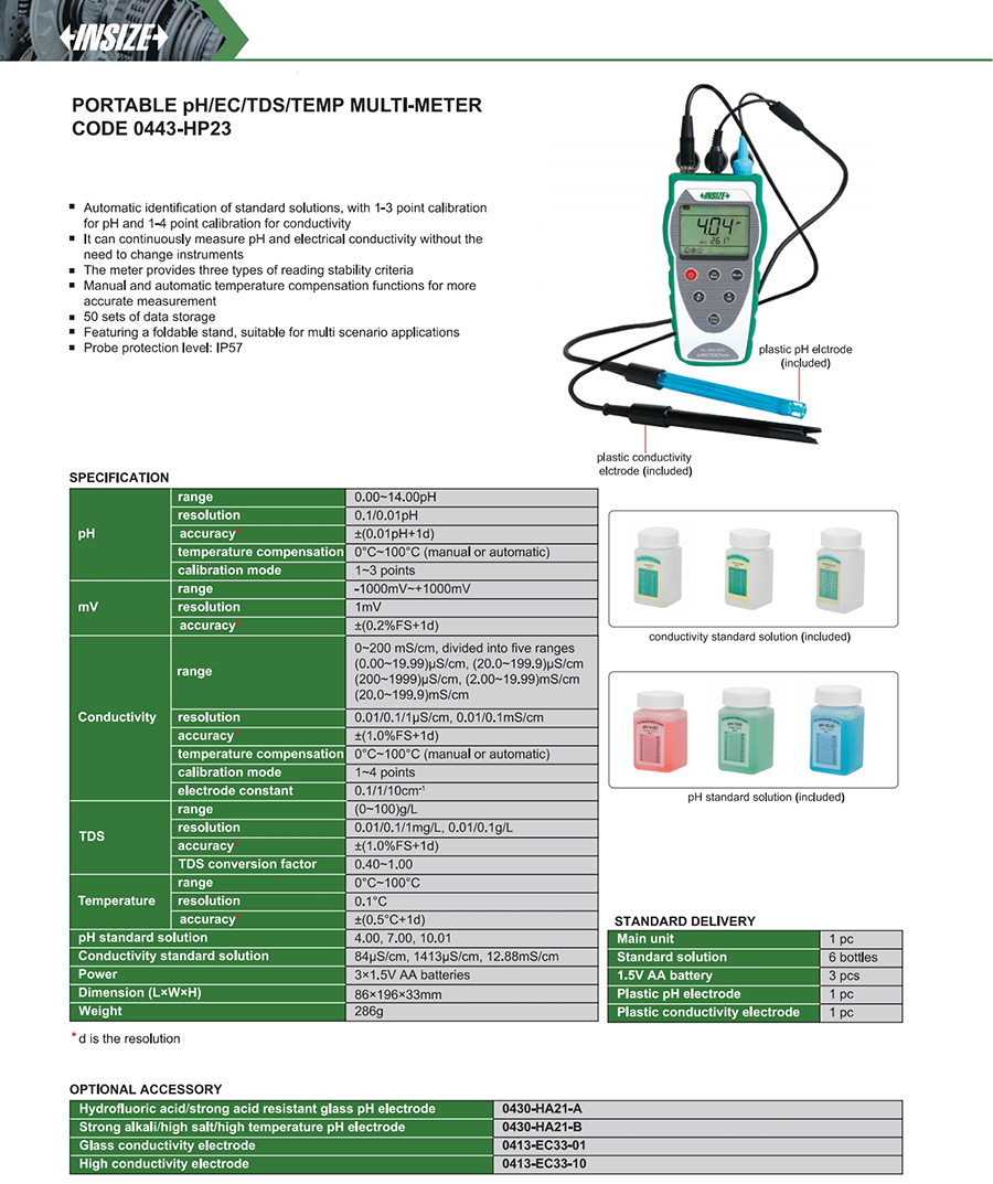 0443-HP23 conductivity/TDS, pH/mV off-line 0.00~14.00pH, -1000mV~+1000mV, 0~200mS/cm, divided into five ranges (0.00~19.99)µS/cm, (20.0~199.9)µS/cm, (200~1999)µS/cm, (2.00~19.99)mS/cm, (20.0~199.9)mS/cm, (0~100)g/L, 0°C~100°C no