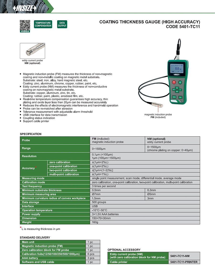 5401-TC11 0~1500μm: FM (included) magnetic induction probe multi-point calibration ±(1μm+1%L) 0.1μm (<100μm), 1μm (100μm~1500μm) USB