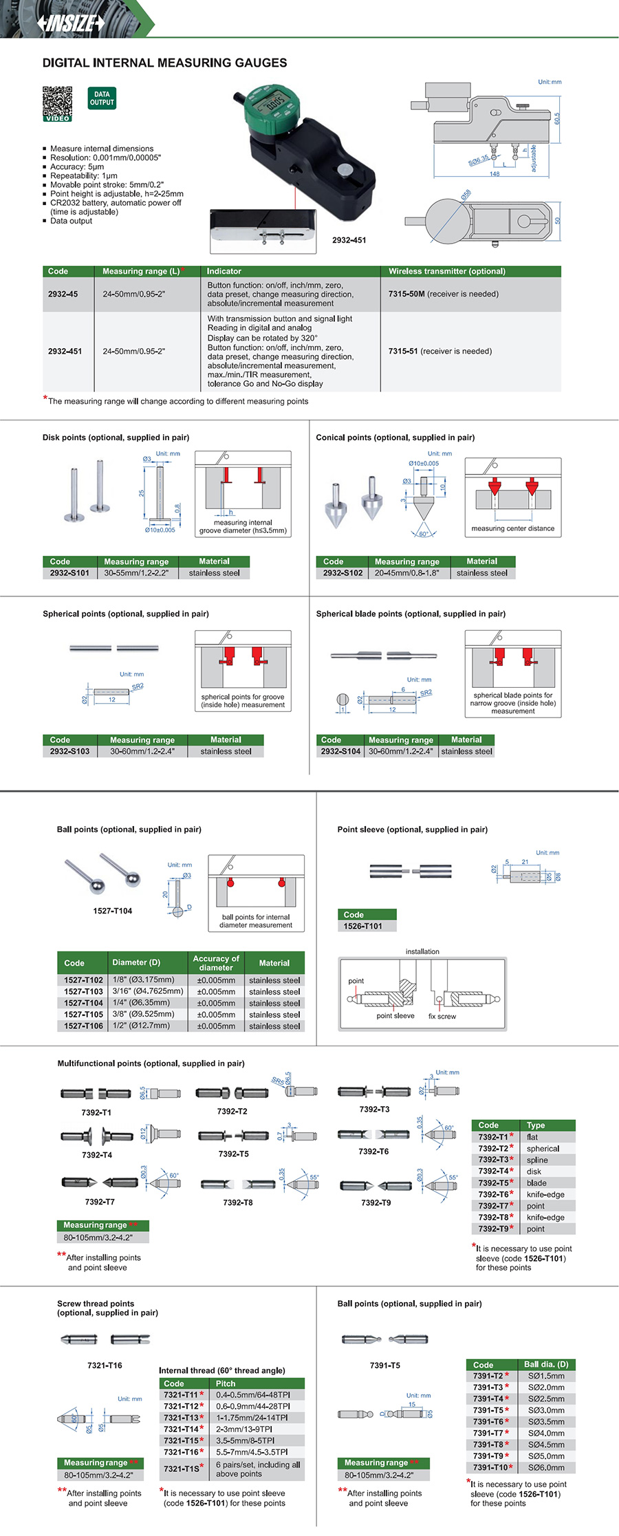 Code Accuracy Resolution Repeatability Range of internal diameter