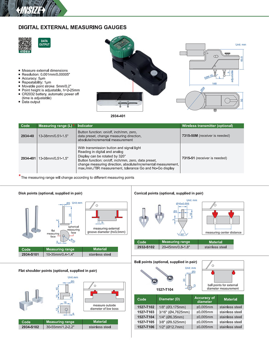 2934-401 5µm 0.001mm/0.00005" 1µm 13-38mm/0.51-1.5"