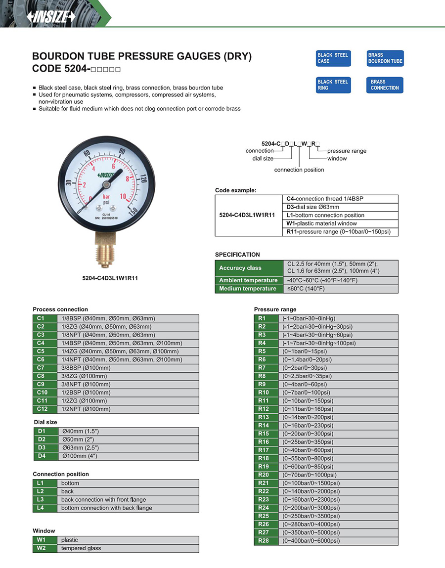 | 5204 | 1/8BSP, 1/8ZG, 1/8NPT, 1/4BSP, 1/4ZG, 1/4NPT, 3/8BSP, 3/8ZG, 3/8NPT, 1/2BSP, 1/2ZG, 1/2NPT | Ø40mm, Ø50mm, Ø63mm, Ø100mm | bottom, back, back connection with front flange, bottom connection with back flange | plastic, tempered glass |
