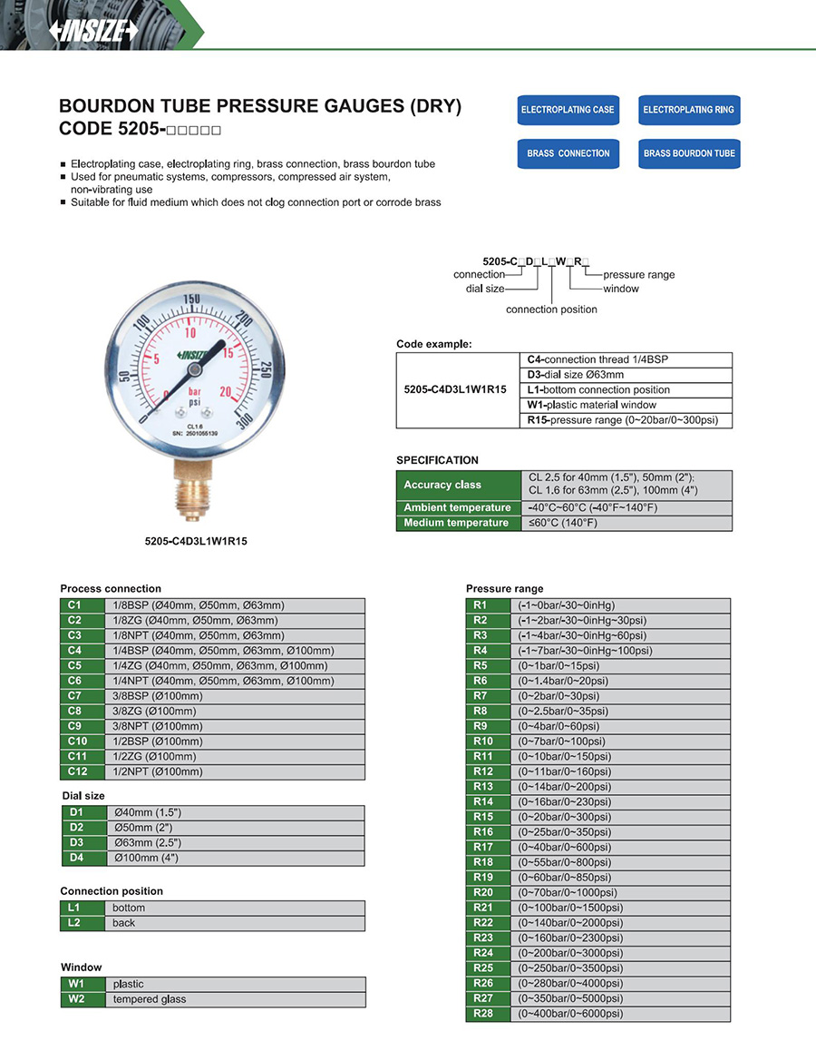 | 5205 | 1/8BSP, 1/8ZG, 1/8NPT, 1/4BSP, 1/4ZG, 1/4NPT, 3/8BSP, 3/8ZG, 3/8NPT, 1/2BSP, 1/2ZG, 1/2NPT | Ø40mm, Ø50mm, Ø63mm, Ø100mm | bottom, back | plastic, tempered glass |