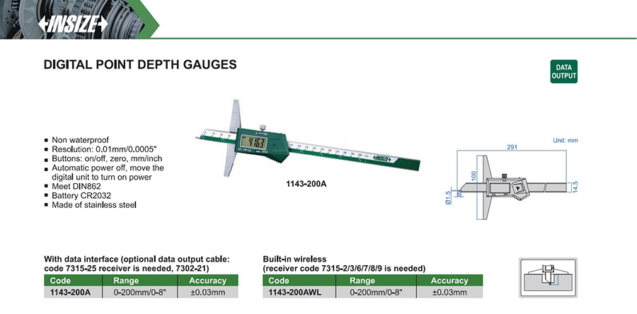 | 1143-200AWL | 0-200mm/0-8" | ±0.03mm | 0.01mm/0.0005" | built-in wireless |